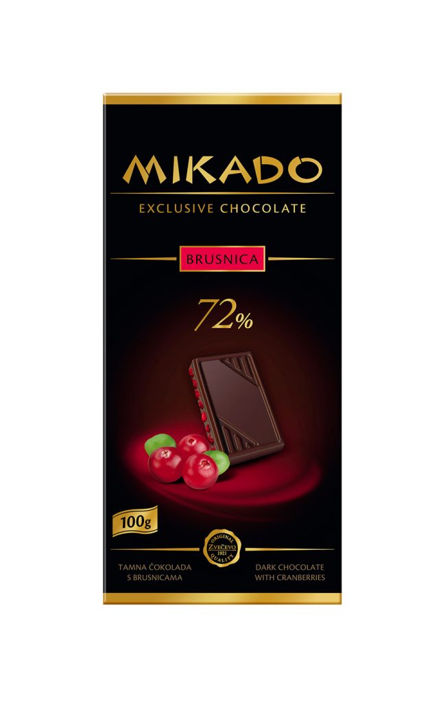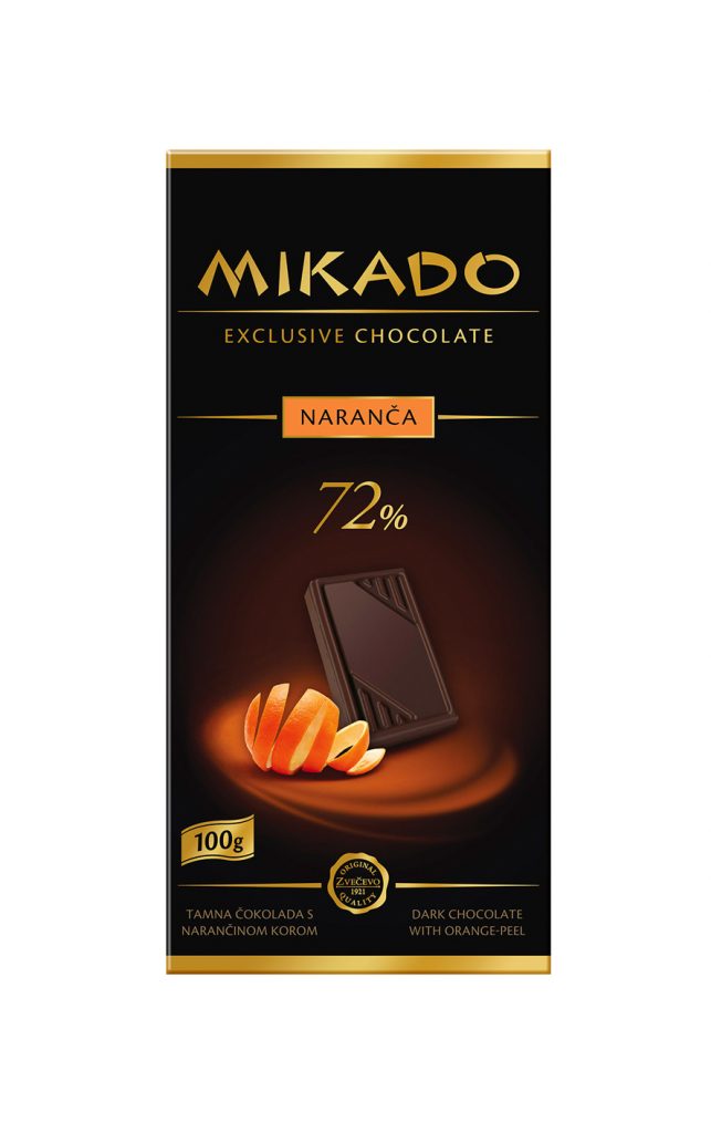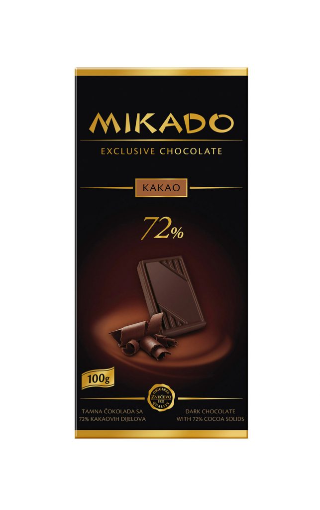 Melem za nepce! Kada se fenomenalnom i posve jedinstvenom okusu doda blagotvoran utjecaj na zdravlje, dobivamo MIKADO TAMNU ČOKOLADU. Odlična topivost i inovativne kombinacije sastojaka stižu u tri neodoljiva okusa: kakao, naranča i brusnica. MIKADO EXCLUSIVE čokolada s minimalno 72 % kakaovih dijelova ima osebujnu aromu te pozitivan utjecaj na zdravlje i opće stanje organizma. Zahvaljujući visokom udjelu kakaa, te od davnina dragocjene namirnice, sva dobra svojstva tamne čokolade u potpunosti dolaze do izražaja. Evo samo nekih: sadrži više antioksidanata, nego mliječna, jer ima veći udio kakaa te ima manje kalorija i bogata je vlaknima pa je pogodna čak i za osobe koje žele smršavjeti. Dakle, nemojte osjećati krivicu, dapače, prepustite se užitku i „prijeđite na tamnu stranu čokolade“. Nekoliko kockica dnevno može vam uvelike uljepšati život!