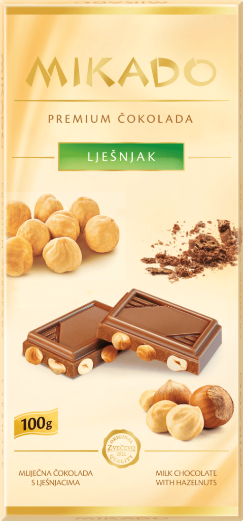Mikado Premium lješnjak čokolada je premijerna verzija klasične čokolade. Bogata i kremasta mliječna čokolada ukrašena je cijelim lješnjacima, koji pružaju zadovoljavajući hrskavi zalogaj i dodaju ugodnu orašastu notu čokoladi. Ova čokolada je savršena za one koji uživaju u klasičnoj kombinaciji okusa