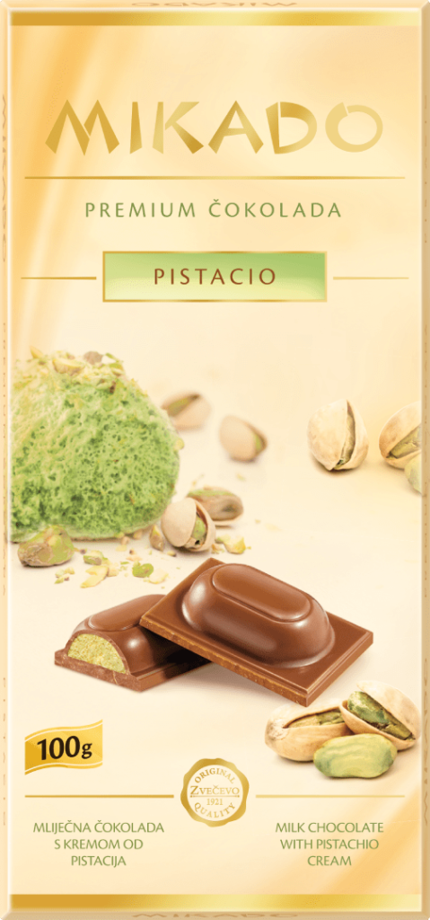 Za one koji vole okus pistacija, Mikado Premium Pistacio čokolada je nešto što morate isprobati. Napravljena od najfinije, kremaste mliječne čokolade i pomiješana s glatkom pistacio kremom, ova čokoladna pločica pruža bogati, orašasti okus koji se topi u ustima. Punjenje pistacio kremom savršeno je izbalansirano i pruža luksuzno okusno iskustvo koje je savršeno za uživanje.